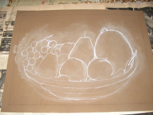 Je trace une esquisse avec un crayon pastel blanc, a l'interieur d'un cadre que je trace au crayon pastel noir pour garder les proportions,